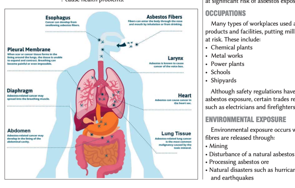 A long duration of asbestos exposure can lead to serious health effects such as asbestosis, lung cancer and mesothelioma. Exposure to asbestos in the workplace is the No. 1 cause of asbestos-related disease and can even occur in the home.