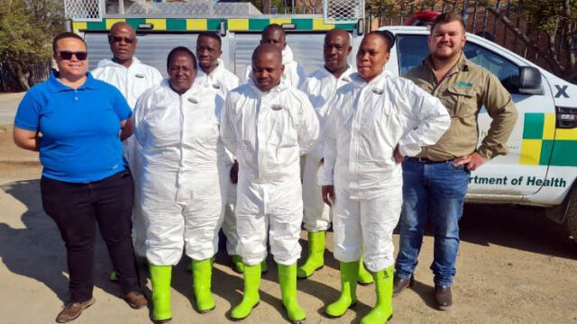 Jean-Henry on the scene with Dept of Health, wearing their donated Tyvek® protective garments and gumboots. Photo credit: Jean Henry Van Rensburg